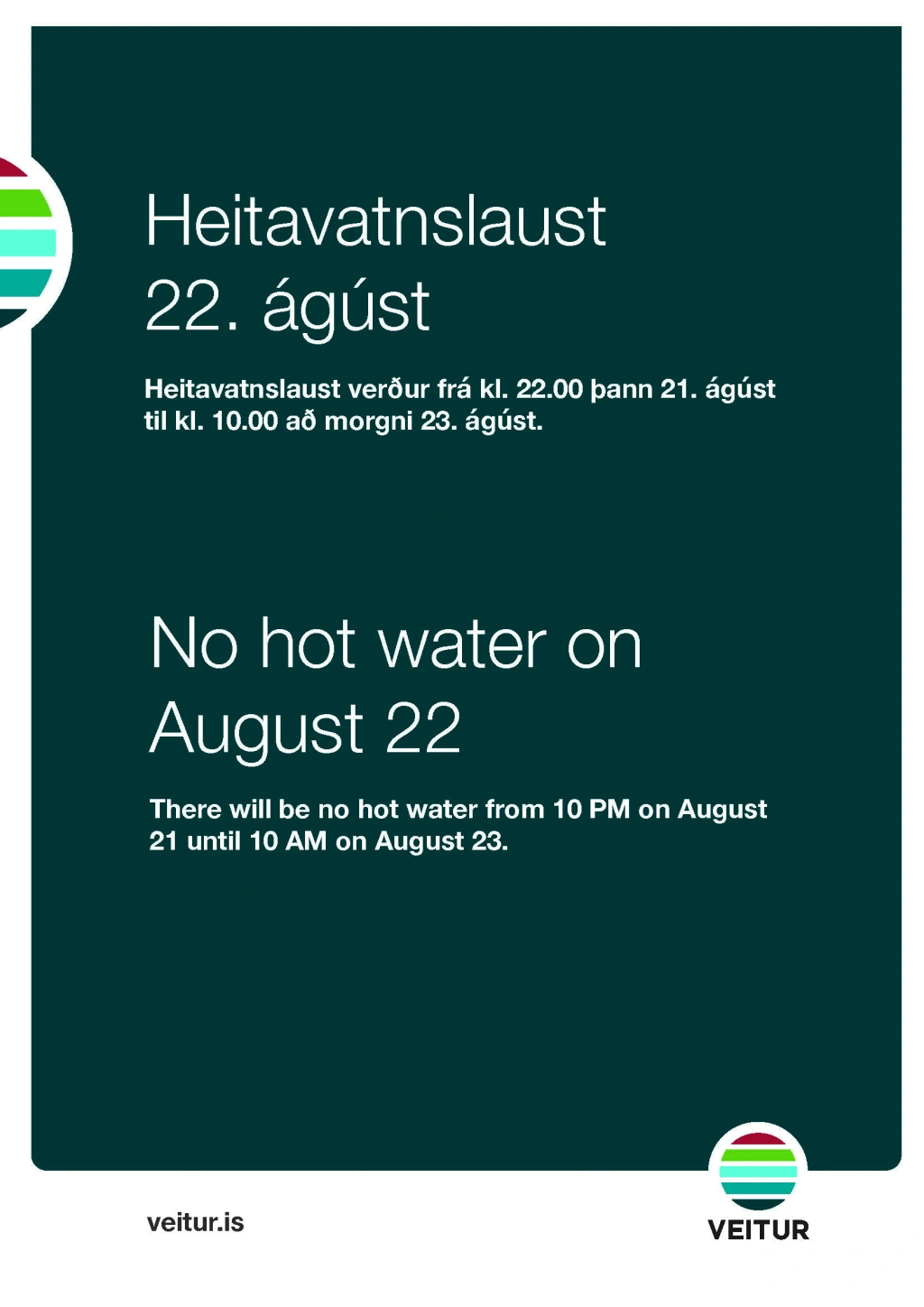 Heitavatnslaust verður frá kl 22:00 þann 21. ágúst til kl 10.00 að morgni 23. ágúst