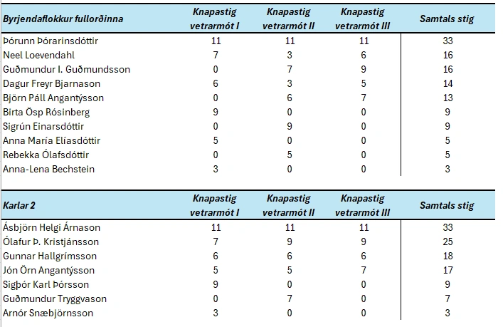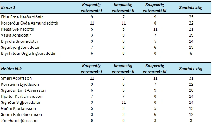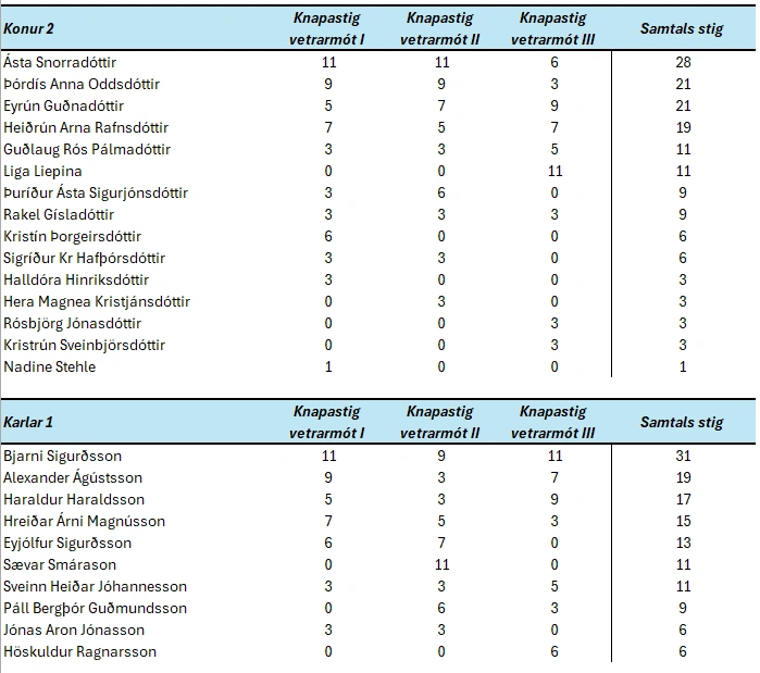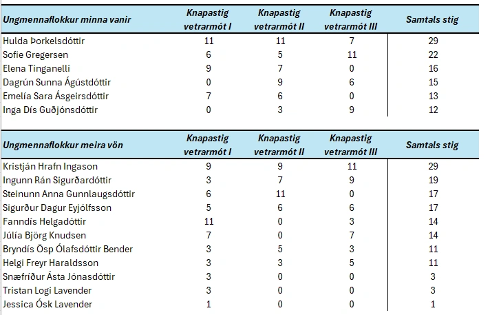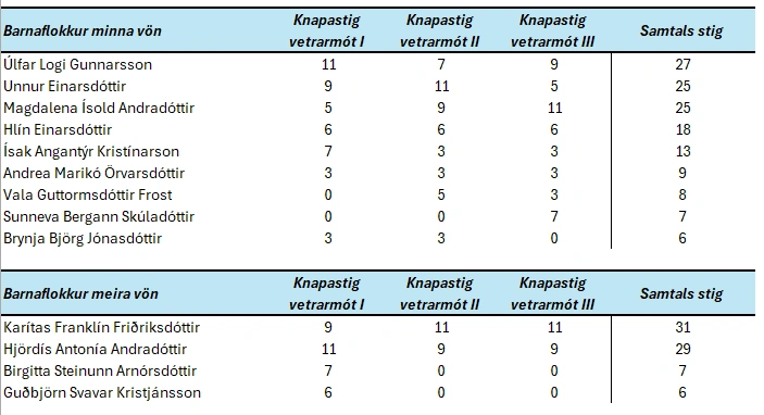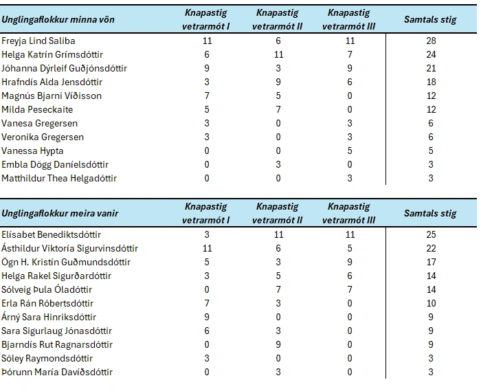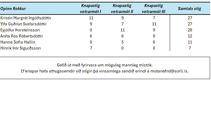 Börn minna vön Börn meira vön Unglingar minna vanir Unglingar meira vanir Ungmenni minna vön Ungmenni meira vön 100m skeið Byrjendaflokkur Konur 2 Karlar 2 Konur 1 Karlar 1 Heldri flokkur Opinn flokkur