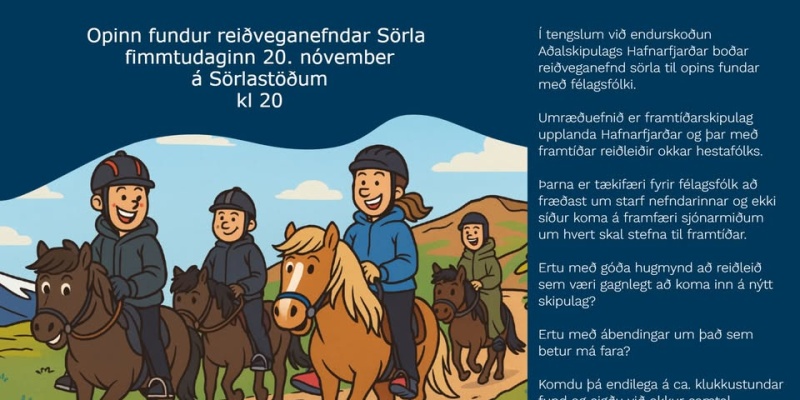 Vekjum athygli ykkar á opnum fundi reiðveganefndar Sörla næsta fimmtudag 20. nóvember kl 20:00. Það væri gaman að sjá sem flesta koma og láta sig skipulag reiðleiða varða.