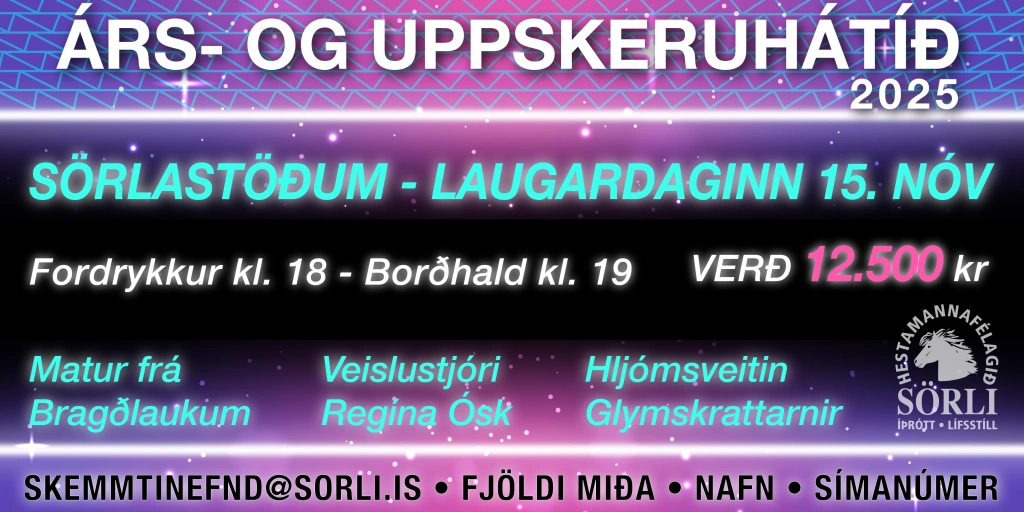 Nú er komið að því að halda Árs- og uppskeruhátíð Hestamannafélagsins Sörla í nýja veislusal okkar á Sörlastöðum, laugardaginn 15. nóvember.
