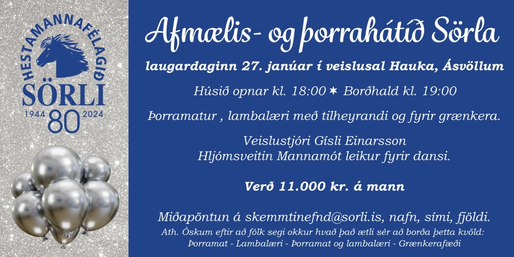Nú er komið að árlegu þorrablóti Sörla sem að þessu sinni verður einnig upphaf af stórafmælisári Hestamannafélagsins Sörla sem verður 80 ára 7. febrúar nk.