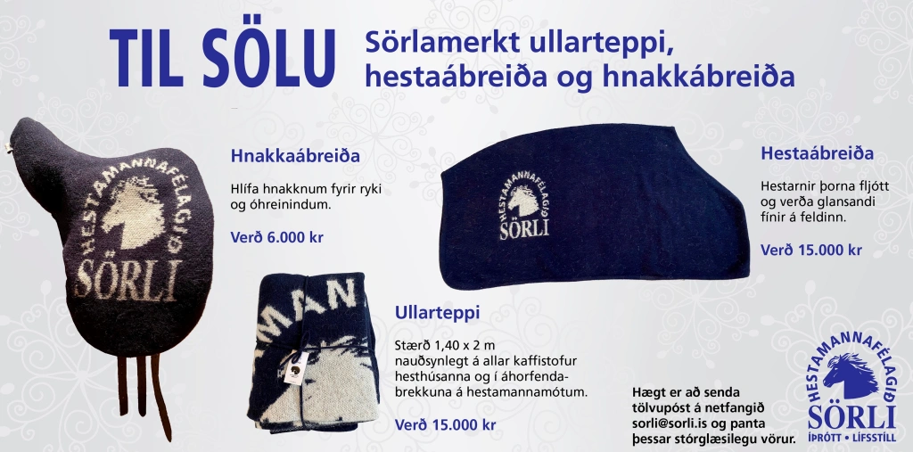 Hægt er að panta sér Sörlamerkt ullarteppi, hestaábreiður og hnakkaábreiður til 8.júní, vörur verða afhentar um 21.júní.Sýnishorn á Sörlastöðum fyrir þá sem hafa áhuga á að skoða.