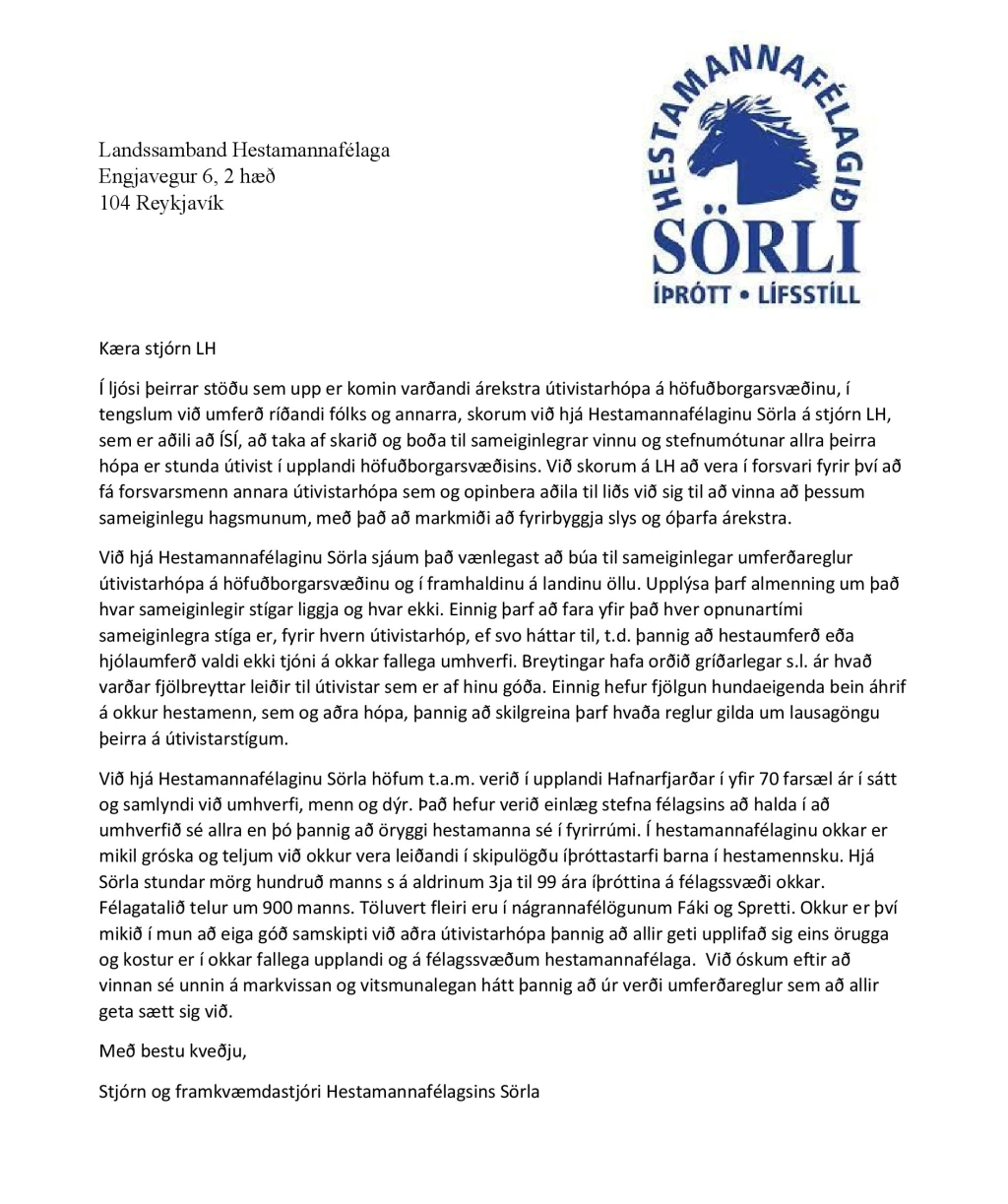 Að gefnu tilefni og í ljósi þeirra neikvæðu umræðna og samskipta sem skapast hafa á meðal mismunandi útivistarhópa hér á höfuðborgarsvæðinu höfum við í Hestamannafélaginu Sörla ákveðið að senda opið bréf með áskorun til Landsambands Hestamannafélaga. Í bréfinu felst áskorun um að LH standi fyrir og leiði vinnu við lausn þeirra ágreiningsmála sem upp hafa komi vegna árekstra ríðandi umferðar og annarrar umferðar. Þetta verði gert í samvinnu íþróttahreyfingarinnar, opinberra aðila og forsvarsmanna annara útivistarhópa. Teljum við brýnt að farið verði í þessa vinnu strax og áður en að ástandið verður verra, bæði á útivistarsvæðunum sjálfum sem og á veraldarvefnum. Í raun snýr öll þessi umræða og allir þessir árekstrar um tilverurétt og öryggismál allra, á öllum þeim stígum, slóðum og vegum sem eru í útjaðri höfuðborgarsvæðisins og að allir geti verið þar óhultir.