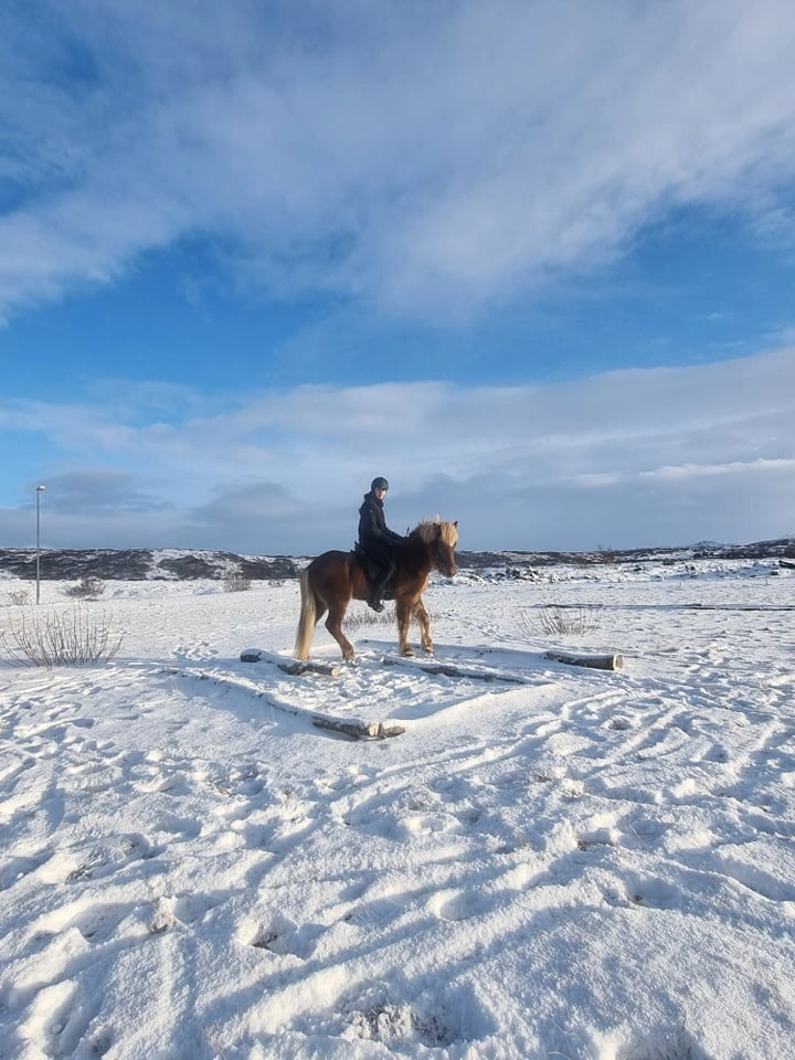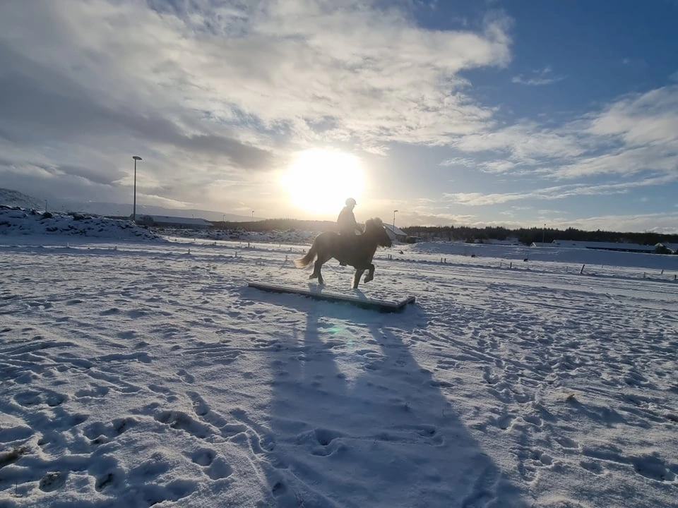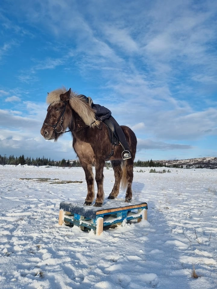Ríða upp á pall, ríða hestinum á feti upp á pall, stöðva hann þar og af pallinum á feti