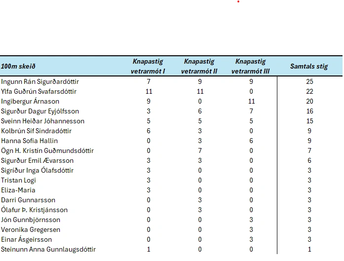 Börn minna vön Börn meira vön Unglingar minna vanir Unglingar meira vanir Ungmenni minna vön Ungmenni meira vön 100m skeið Byrjendaflokkur Konur 2 Karlar 2 Konur 1 Karlar 1 Heldri flokkur Opinn flokkur